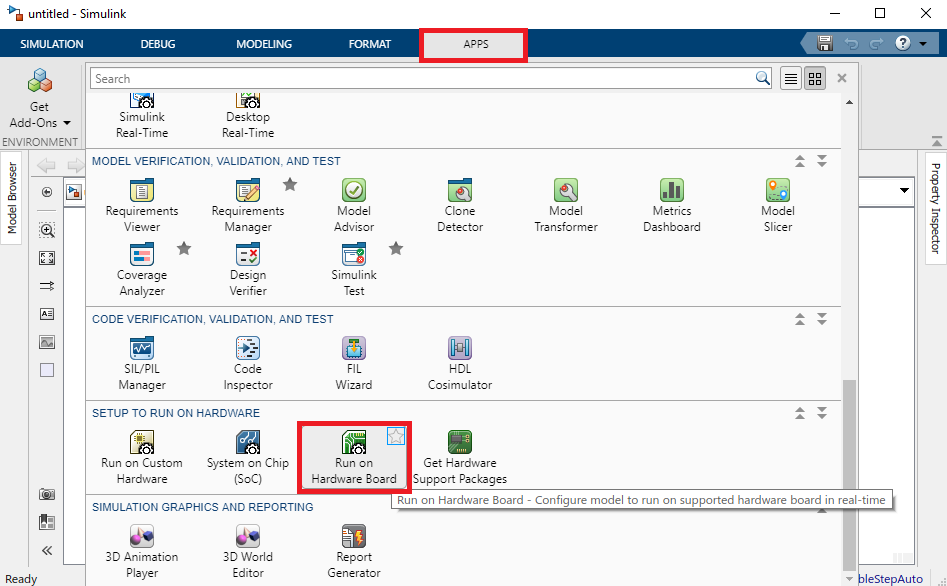 V záložke APPS rozbalíme roletku a preskrolujeme sa na Run on Hardware Board.