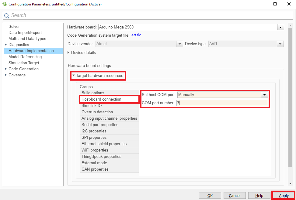 Po zvolení zariadenia sa pridá v modeli záložka HARDWARE. Arduino môžeme konfigurovať pomocou tlačidla Hardware Settings. Niekedy sa môže stať, že MATLAB automaticky nerozpozná port, na ktorý je Arduino pripojené do počítača. V takom prípade musíme