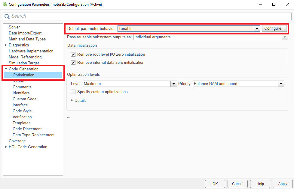 Ladenie parametrov odomkne voľba Tunable v časti Code Generation a Optimization.
