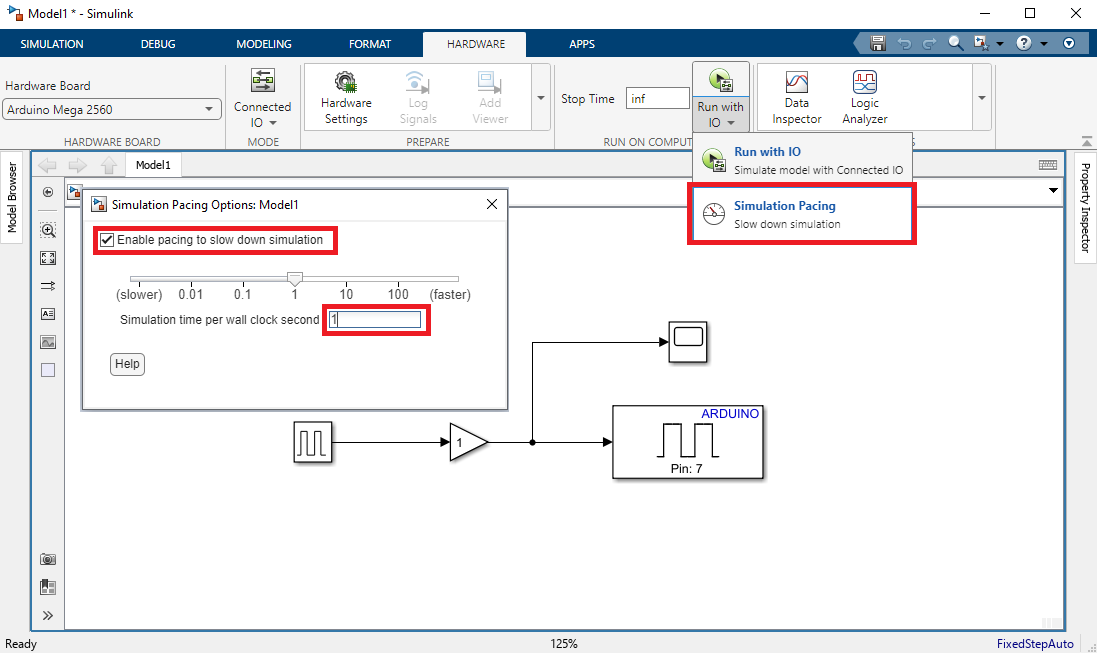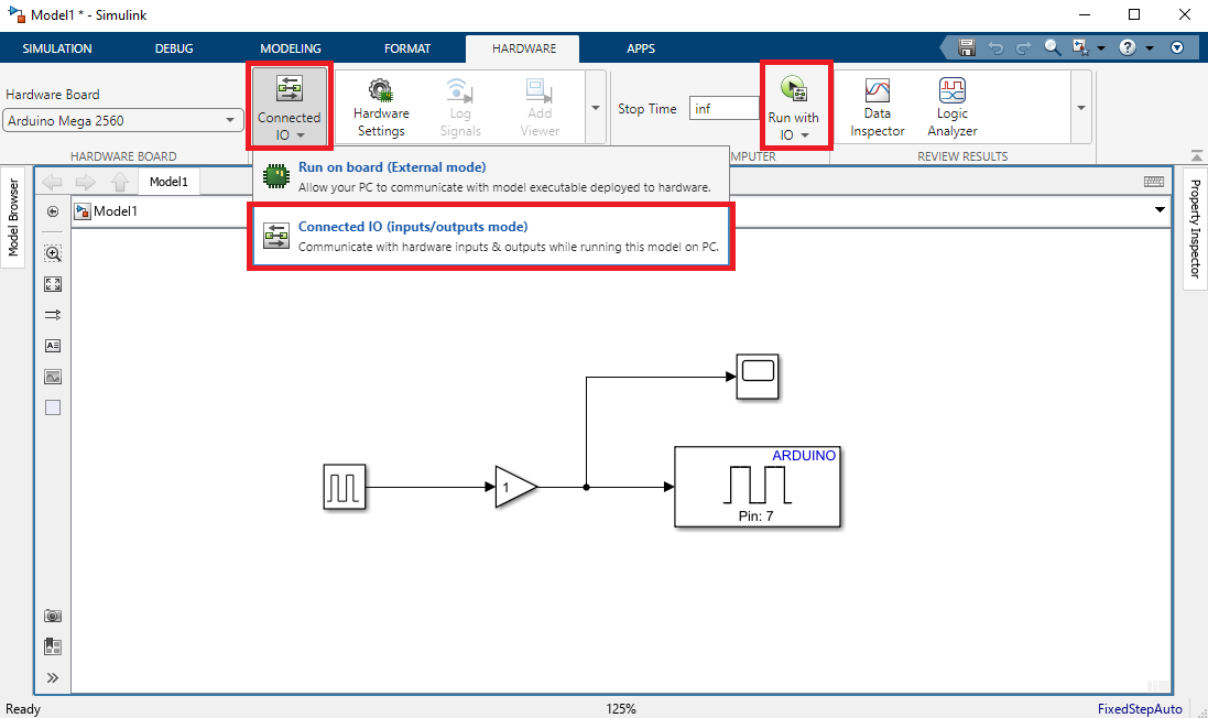 Prvý režim, ktorý si spomenieme je Connected IO. V tomto režime komunikujeme s Arduinom ako v prostredí MATLAB. Simulink teda nahrá na Arduino komunikačné rozhranie, pomocou ktorého sme schopní ovládať vstupy a výstupy. V záložke Hardware musíme prepnúť mod na Connected IO. Pokiaľ chcete, aby algoritmus bežal až kým ho nezastavíte, nastavte čas simulácie v časti Stop Time na inf. Model môžete spustiť tlačidlom Run with IO.