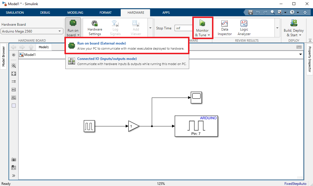 Veľké plus Simulinku je možnosť interaktívneho ladenia a zobrazovania signálov. Pokiaľ váš model obsahuje vstupné bloky ako je napríklad konštanta (Constant) alebo výstupné bloky ako je Display alebo Scope môžeme ich po nahratí na zariadenie meniť alebo sledovať. Pre nahratie modelu na zariadenie a jeho interaktívne ladenie môžeme využiť možnosť Monitor & Tune. Pokiaľ chcete, aby algoritmus bežal až kým ho nezastavíte, nastavte čas simulácie v časti Stop Time na inf. Interaktívny režim spustíte tlačidlom Monitor & Tune. Simulink preloží a nahrá model na zariadenie (čo pár sekúnd bude trvať, sledujte výpisy v ľavej dolnej časti okna modelu) a po nahratí a spojení sa s arduinom spustí algoritmus. Algoritmus zastavíte tlačidlom Stop, aj keď ste nastavili čas na nekonečno.