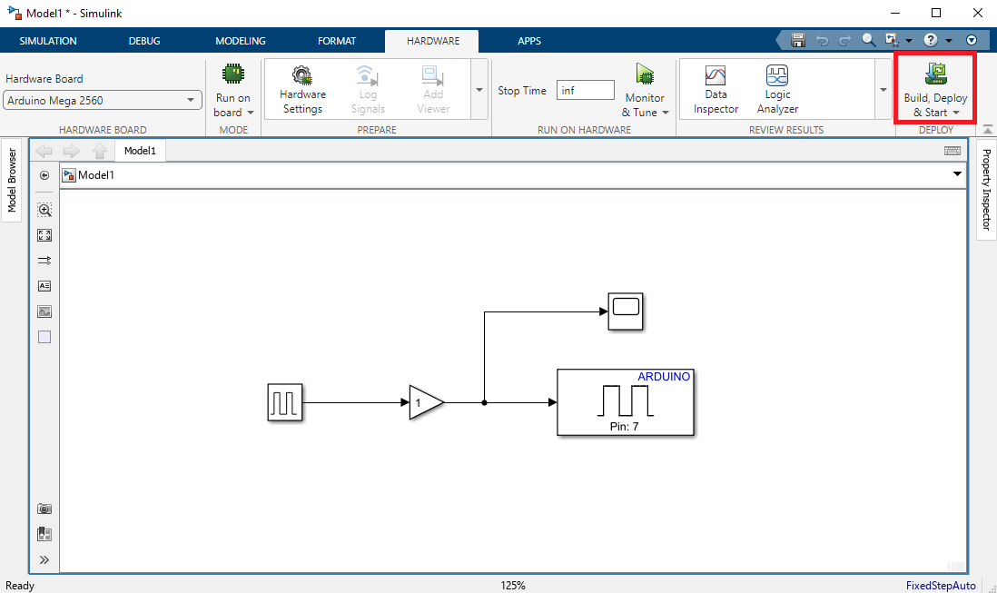 Interaktívny režim je dobrý na ladenie, ale aj keď algoritmus beží na Arduine potrebujeme spojenie s počítačom a Simulink. Našim cieľom je však, aby algoritmus bežal na Arduine bez pripojenia k počítaču. Simulink poskytuje voľbu Build, Deploy & Start, ktorá nahrá a spustí algoritmus na Arduino. Po úspešnom nahratí (znova to môže trvať pár sekúnd, sledujte výpisy v ľavej dolnej časti okna modelu) môžete Arduino odpojiť od počítača a pripojiť externú baterku (PowerBanku). Po pripojení baterky sa algoritmus spustí nanovo.
